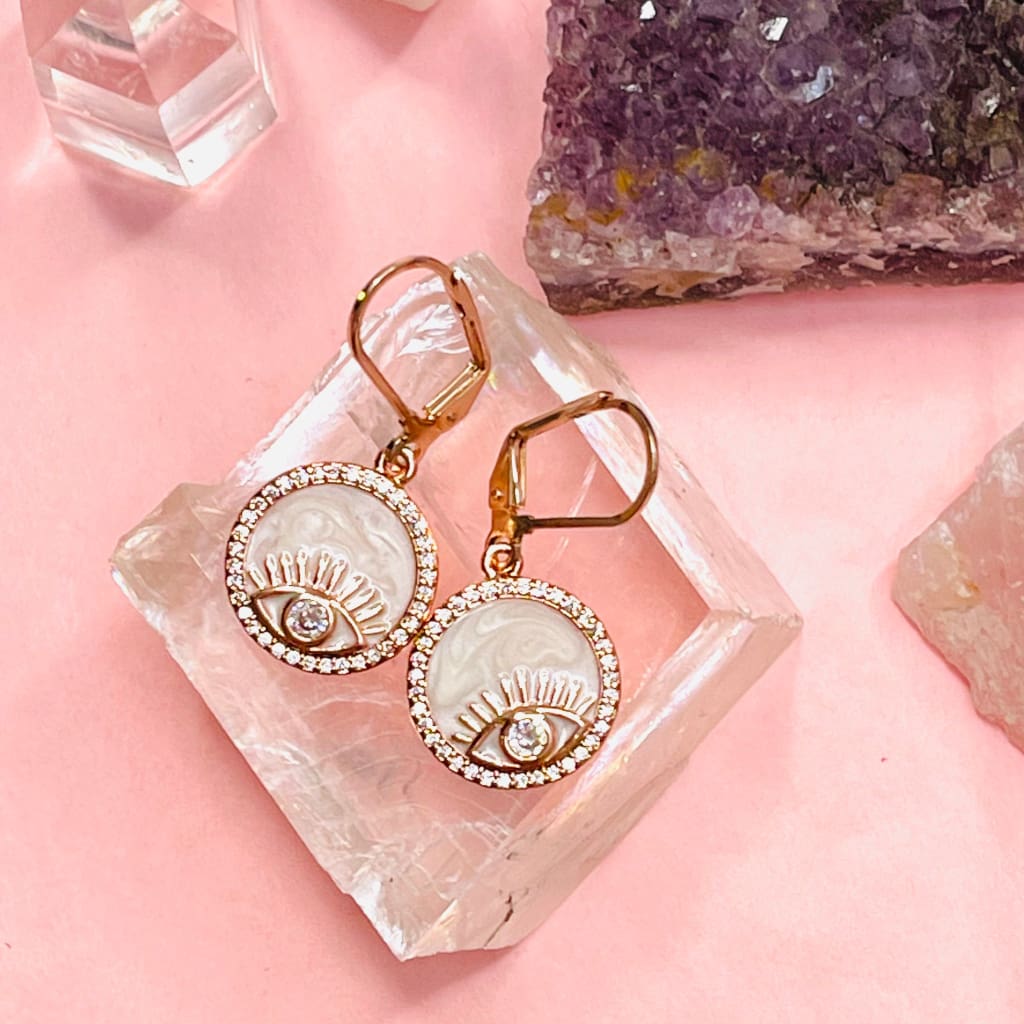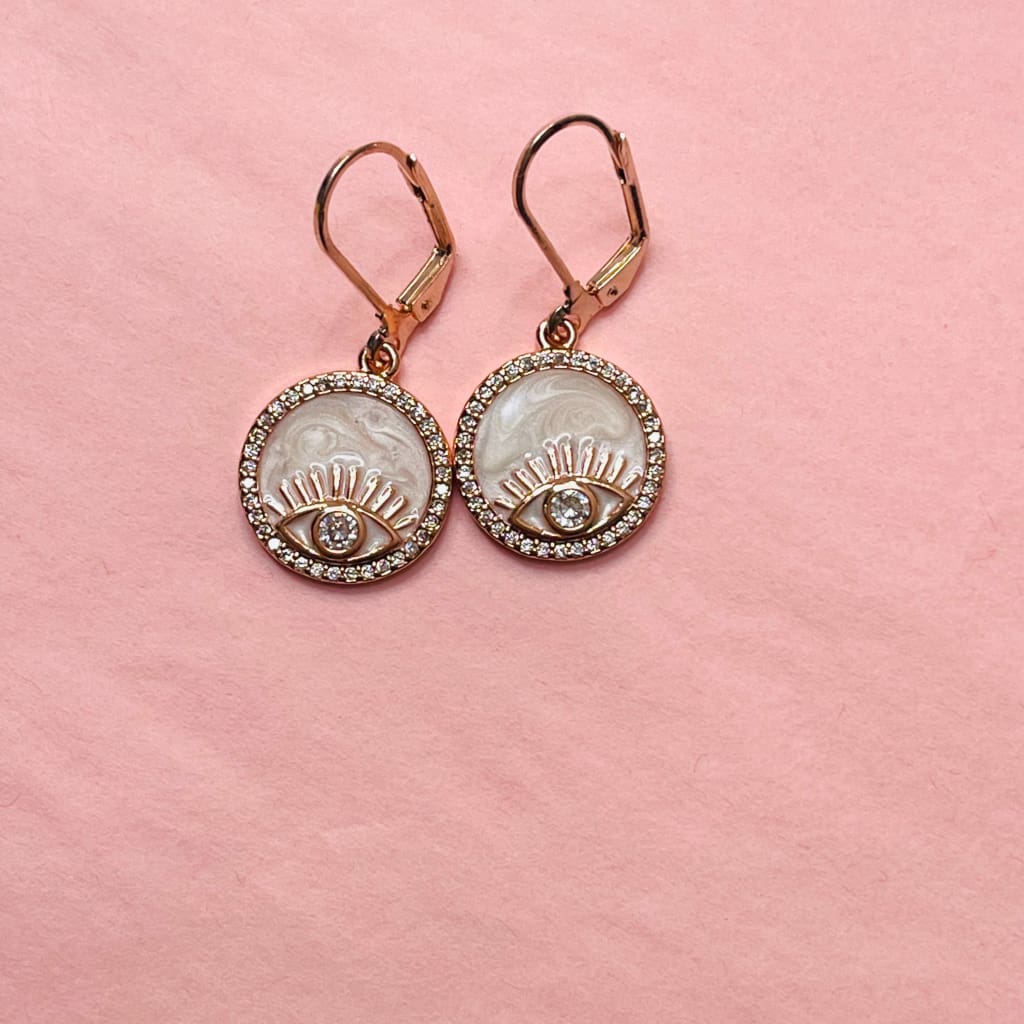 18K Rose Gold Plated Brass + Glass + White Enamel Evil Eye, Cubic Zirconia (16mm wide, 18mm long)